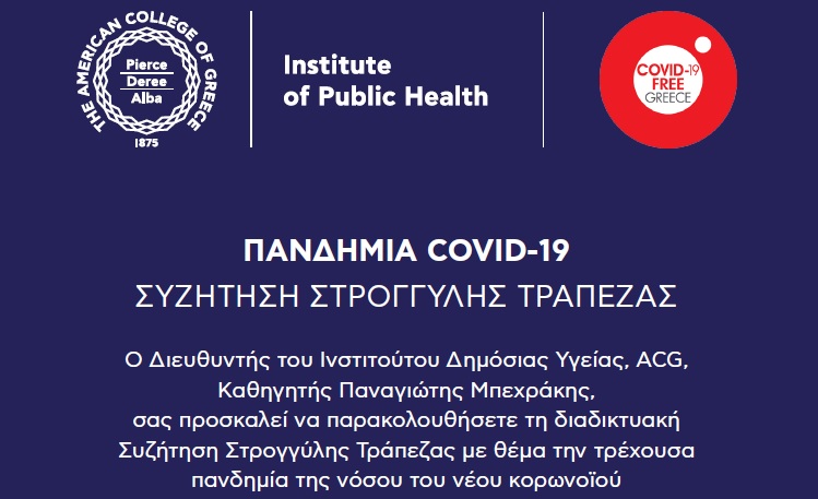 Το Ινστιτούτο Δημόσιας Υγείας, του Αμερικανικού Κολλεγίου Ελλάδος, προσαρμοζόμενο στις νέες συνθήκες, επανεκκινεί τον 5ο ετήσιο κύκλο διαλέξεων με τίτλο «Θέματα Δημόσιας Υγείας», διοργανώνοντας την Παρασκευή 10 Απριλίου 2020 και ώρα 18:30, διαδικτυακή Συζήτηση Στρογγύλης Τράπεζας με θέμα «Πανδημία COVID-19».